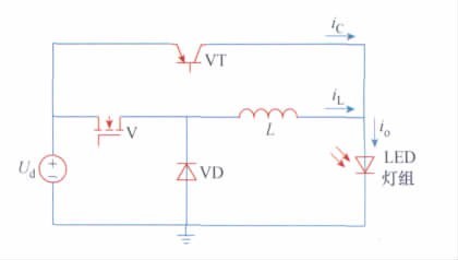 電路如圖1 所示。電路結(jié)構(gòu)以BUCK電路為主,取消電解電容濾波,用輔助線性電路對電感紋波電流進(jìn)行補(bǔ)償。圖中由開關(guān)管V、電感L、LED 燈組、續(xù)流二極管VD 組成主電路; 晶體管VT 為輔助補(bǔ)償電路。