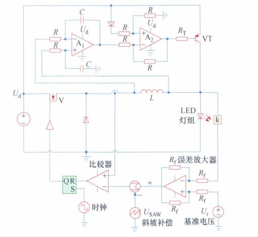 本文提出一種有源紋波補(bǔ)償BUCK 型LED 驅(qū)動(dòng)電路。該電路無需使用大容量電解電容,所需要的小容量電容可以采用能量密度較小的新型長壽命電容,利用有源補(bǔ)償技術(shù)抑制輸出紋波電流。由于取消電解電容的使用,可以使電路壽命增長,穩(wěn)定性提高,便于集成,電路易小型化。