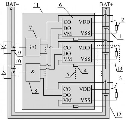 采用單節(jié)鋰電池保護(hù)芯片設(shè)計(jì)的具備均衡充電能力的鋰電池組保護(hù)板示意圖如圖1所示。其中:1為單節(jié)鋰離子電池;2為充電過電壓分流放電支路電阻;3為分流放電支路控制用開關(guān)器件;4為過流檢測保護(hù)電阻;5為省略的鋰電池保護(hù)芯片及電路連接部分;6為單節(jié)鋰電池保護(hù)芯片(一般包括充電控制引腳CO,放電控制引腳DO,放電過電流及短路檢測引腳VM,電池正端VDD,電池負(fù)端VSS等);7為充電過電壓保護(hù)信號經(jīng)光耦隔離后形成并聯(lián)關(guān)系驅(qū)動主電路中充電控制用MOS管柵極;8為放電欠電壓、過流、短路保護(hù)信號經(jīng)光耦隔離后形成串聯(lián)關(guān)系驅(qū)動主電路中放電控制用MOS管柵極;9為充電控制開關(guān)器件;10為放電控制開關(guān)器件;11為控制電路;12為主電路;13為分流放電支路。單節(jié)鋰電池保護(hù)芯片數(shù)目依據(jù)鋰電池組電池?cái)?shù)目確定,串聯(lián)使用,分別對所對應(yīng)單節(jié)鋰電池的充放電、過流、短路狀態(tài)進(jìn)行保護(hù)。該系統(tǒng)在充電保護(hù)的同時,通過保護(hù)芯片控制分流放電支路開關(guān)器件的通斷實(shí)現(xiàn)均衡充電,該方案有別于傳統(tǒng)的在充電器端實(shí)現(xiàn)均衡充電的做法,降低了鋰電池組充電器設(shè)計(jì)應(yīng)用的成本。