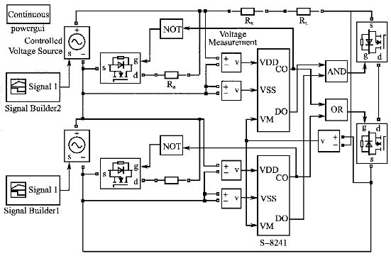 根據(jù)上述均衡充電保護(hù)板電路工作的基本原理,在Matlab/Simulink環(huán)境下搭建了系統(tǒng)仿真模型,模擬鋰電池組充放電過程中保護(hù)板工作的情況,驗(yàn)證該設(shè)計(jì)方案的可行性。為簡單起見,給出了鋰電池組僅由2節(jié)鋰電池串聯(lián)的仿真模型,如圖5所示。
