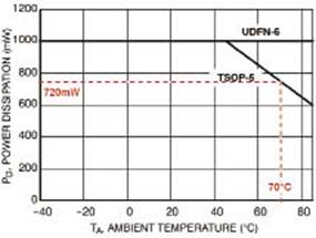 環(huán)境溫度低于70℃時(shí),TSOP-5和µDFN-6封裝都可以耗散720mW的功率,因此能滿足這一應(yīng)用的最壞情況要求。然而,µDFN-6封裝的功率耗散能力更強(qiáng),與采用TSOP-5封裝的同等轉(zhuǎn)換器設(shè)計(jì)相比,能夠承受的溫度更高。