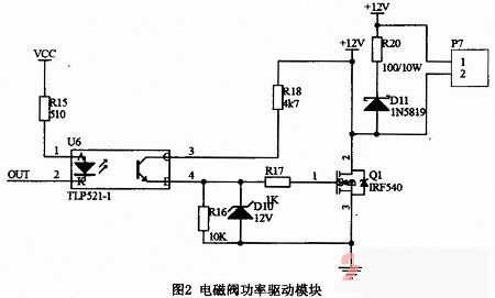 圖2所示的是電磁閥功率驅(qū)動模塊。其中,P7插座連接高速電磁閥,電磁閥線圈一端連接電源,另一端連接場效應(yīng)管漏極。Q1是場效應(yīng)管IRF540,起放大作用。U6是可控制的光電耦合器件TLP521-1,它廣泛應(yīng)用于電路之間的信號傳輸,將ECU與負載隔離,可以增加電路的安全性,減小電路干擾,簡化電路設(shè)計。當ECU發(fā)出驅(qū)動信號,光耦導(dǎo)通,穩(wěn)壓二極管D10將場效應(yīng)管Q1的柵極電壓穩(wěn)定在12V,漏極電流增大,漏極電壓被拉低。此時,電磁閥線圈電流增大,線圈產(chǎn)生強大的電動勢,電磁閥被打開。而當光耦截止時,電磁閥關(guān)閉,線圈中電路變化很大,會產(chǎn)生反電動勢。R20功率電阻和D11肖特基二極管IN5819與電磁閥并聯(lián),防止場效應(yīng)管被擊穿。
