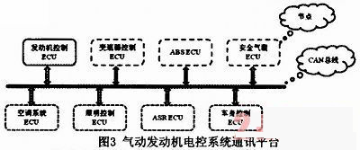 氣動發(fā)動機的控制系統(tǒng)是極其復(fù)雜的,不僅包括轉(zhuǎn)速、油門位置等信號的采集處理;還要對電磁閥的噴氣定時和噴氣量完成精確控制等等。另外,氣動汽車上還包括ABS、空調(diào)系統(tǒng)和車輛燈光等模塊,這些模塊需要實時共享車輛的數(shù)據(jù),以達到整車的最優(yōu)控制。傳統(tǒng)的電氣控制設(shè)計策略已經(jīng)不能滿足當今電氣控制網(wǎng)絡(luò)的需要,而CAN總線的數(shù)據(jù)通訊具有突出的可靠性、實用性和靈活性等特點。氣動發(fā)動機電控系統(tǒng)通訊平臺如圖3所示。它具有布線成本低、通訊速率高和數(shù)據(jù)傳輸精度高等優(yōu)勢。