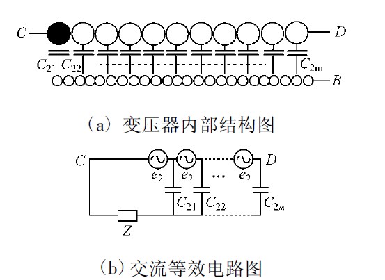 在僅二次繞組有感應(yīng)電動勢、一次繞組電動勢為零的情況如圖6 所示。圖6 中:e2為每匝二次繞組的感應(yīng)電動勢;C2x為一匝二次繞組與一次繞組最外層間的寄生電容。