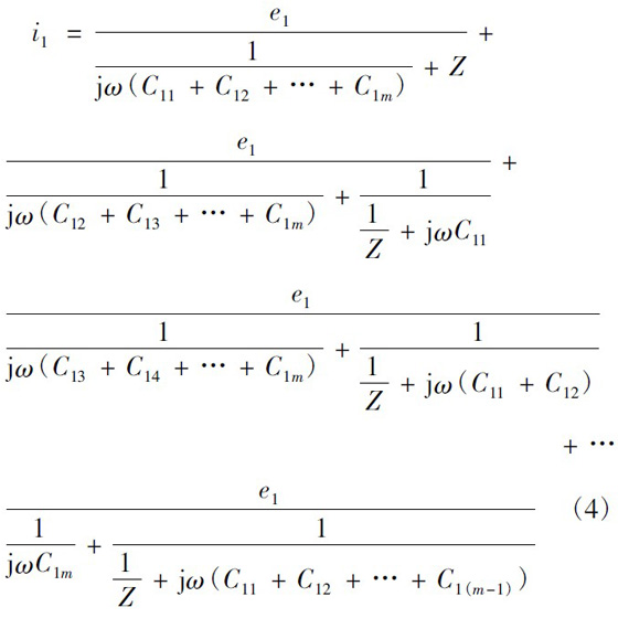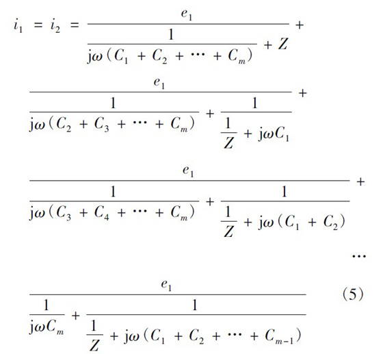 設(shè)一次繞組有3 層,每層m 匝,二次繞組僅一層,為n 匝。當(dāng)變壓器磁芯中的磁通發(fā)生變化,便會同時(shí)在一次側(cè)和次級產(chǎn)生感應(yīng)電動勢。根據(jù)疊加定理,可認(rèn)為這是僅一次繞組有感應(yīng)電動勢、二次繞組電動勢為零和僅二次繞組有感應(yīng)電動勢、一次繞組電動勢為零兩種情況的疊加。僅一次繞組有感應(yīng)電動勢、二次繞組電動勢為零的情況如圖5 所示。圖5 中:e1為每匝一次繞組的感應(yīng)電動勢;C1x為一匝最外層一次繞組與二次繞組間的寄生電容。