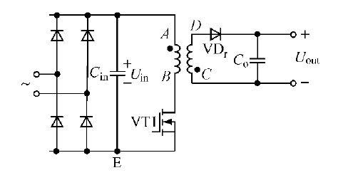 以反激式變換器為例,其主電路如圖1 所示。開關(guān)管開通后,變壓器一次側(cè)電流逐漸增加,磁芯儲能也隨之增加。當(dāng)開關(guān)管關(guān)斷后,二次側(cè)整流二極管導(dǎo)通,變壓器儲能被耦合到二次側(cè),給負(fù)載供電。