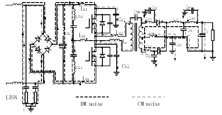 通常電路中的共模干擾和差模干擾是同時(shí)存在的,共模干擾存在于電源的任意一個(gè)相線與大地之間,差模干擾存在于相線與相線之間。法國Grenoble 電技術(shù)實(shí)驗(yàn)室的Teuling、Schnaen 和Roudet 基于由MOSFET 構(gòu)成的400W、開關(guān)頻率為100KHz 的斬波電路實(shí)驗(yàn)?zāi)P偷难芯勘砻鳎皖l時(shí)差模干擾占主導(dǎo)地位;高頻時(shí),共模干擾占主導(dǎo)地位,這說明開關(guān)電源的差模干擾和共模干擾對(duì)電路的影響程度是不同的;另一方面,線路寄生參數(shù)對(duì)差模干擾和共模干擾的影響也不同,由于線間阻抗與線———地阻抗不同,干擾經(jīng)長距離傳輸后,差模分量的衰減要比共模大。因此,為了解決開關(guān)電源的傳導(dǎo)噪聲問題,需要首先區(qū)分共模和差模干擾,這就需要建立共模和差模噪聲路徑,然后對(duì)它們分別進(jìn)行仿真和分析,這種方法便于我們找到電磁干擾問題的根源,便于問題的解決。