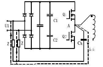 在PWM變換器工作時(shí),伴隨著開關(guān)器件的工作,也相應(yīng)產(chǎn)生了共模噪聲。如圖1 所示,對(duì)于半橋變換器,開關(guān)管Q1 的漏級(jí)電壓始終為U1,源級(jí)電位隨開關(guān)狀態(tài)的改變而在0 和U1/2 之間變化;Q2 的源極電位始終為0,漏極電位在0 和U1/2之間變化。為使開關(guān)管和散熱器能保持良好接觸,往往在開關(guān)管底部與散熱器之間加上絕緣墊片或者抹上導(dǎo)熱性能良好的絕緣硅膠。這使得A 點(diǎn)對(duì)地之間相當(dāng)于存在一個(gè)并聯(lián)耦合電容CK。當(dāng)開關(guān)管Q1、Q2 的狀態(tài)發(fā)生改變,使A 點(diǎn)電位發(fā)生變化時(shí),就會(huì)在CK 上產(chǎn)生噪聲電流Ick,如圖2 所示。該電流由散熱器到達(dá)機(jī)殼,而機(jī)殼也即大地與主電源線存在耦合阻抗,形成圖2中虛線所示的共模噪聲通路。于是,共模噪聲電流在地與主電源線的耦合阻抗Z 上產(chǎn)生壓降,形成共模噪聲。
