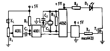 為了穩(wěn)定被調(diào)制光信號的頻率,電路中使用了分頻器CD4060 。它帶有一個外接晶體振蕩器,內(nèi)部有多級分頻器。對于1M 晶振來說,經(jīng)過4 060 的六次分頻,可以得到頻率穩(wěn)定的151625kHz 的方波,再通過功率場效應(yīng)管的電流放大,就可以同時驅(qū)動上百個發(fā)光二極管同時發(fā)光。