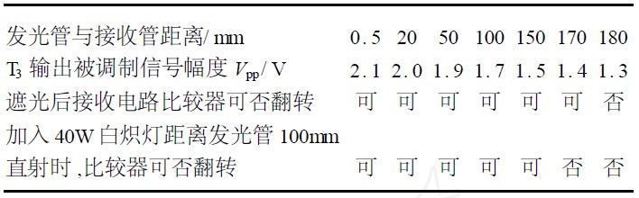 表1 為實驗測得的數(shù)據(jù)。發(fā)光管和接收管之間正面相對, 兩者之間無聚焦光學元件。用有無遮光對整機主要參數(shù)進行測試。由表可知,兩管表面之間的相對距離在015~170mm范圍內(nèi),無需調(diào)整靈敏度都能正常工作。