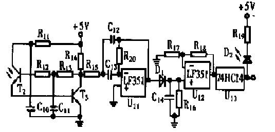 圖2 中的U11 組成二階帶通濾波器, 可以濾去151625kHz 以外的信號。該級增益為1 , Q 值為5 ,截止頻率、中心頻率以及濾波特性容易調(diào)整。二極管D1 和電容C14組成檢波電路,可以從151625kHz 信號上解調(diào)出包絡(luò)信號。上述兩部分電路可以濾除陽光、日光燈、白熾燈等干擾源的作用。