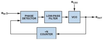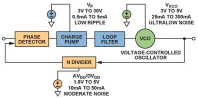 鎖相環(huán)(PLL)是現(xiàn)代通信系統(tǒng)的基本構(gòu)建模塊PLLs通常用在無線電接收機或發(fā)射機中,主要提供"本振"(LO)功能;也可用于時鐘信號分配和降噪,而且越來越多地用作高采樣速率模數(shù)或數(shù)模轉(zhuǎn)換的時鐘源。由于每一代PLL的噪聲性能都在改善,因此電源噪聲的影響變得越來越明顯,某些情況下甚至可限制噪聲性能。本文討論圖1所示的基本PLL方案,并考察每個構(gòu)建模塊的電源管理要求。
