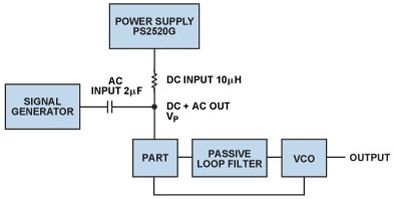 電荷泵的低功耗使其看似頗具吸引力,可使用升壓轉(zhuǎn)換器從較低的電源電壓產(chǎn)生高電荷泵電壓,然而與此類DC-DC轉(zhuǎn)換器相關(guān)的開關(guān)頻率紋波可能在VCO的輸出端產(chǎn)生干擾雜散音。高PLL雜散可能造成發(fā)射機發(fā)射屏蔽測試失敗,或者降低接收機系統(tǒng)內(nèi)的靈敏度和帶外阻塞性能。為幫助指導轉(zhuǎn)換器紋波的規(guī)格,使用圖6的測量設置針對各種PLL環(huán)路帶寬獲得全面電源抑制曲線圖與頻率的關(guān)系。
