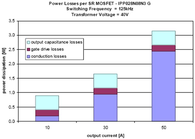 要優(yōu)化SR MOSFET的效率,必須找到開關(guān)損耗與導(dǎo)通損耗之間的最佳平衡點。在輕負(fù)載條件下,RDS(on)導(dǎo)通損耗占總功耗的比例極低。在這種情況下,在整個負(fù)載范圍內(nèi)基本保持不變的開關(guān)損耗是主要損耗。但是,當(dāng)輸出電流較高時,導(dǎo)通損耗則成為最主要的損耗,其占總功耗的比例也最高,請參見圖2。
