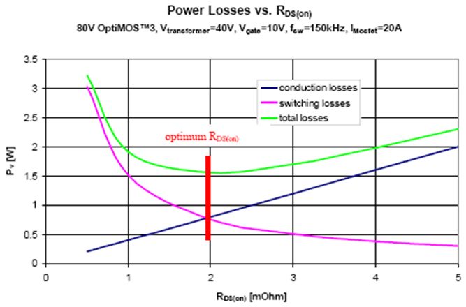 在選擇最適當(dāng)?shù)腗OSFET時,必須特別注意RDS(on) 的取值范圍,如圖3所示。當(dāng)RDS(on)超出最優(yōu)值時,總功耗將隨RDS(on)的提高而線性增加。但當(dāng)RDS(on) 降至低于最優(yōu)值時,總功耗也會因輸出電容的快速增加而急劇上升。此外,在圖3中可以看出,可實現(xiàn)最低功耗的RDS(on)值范圍相當(dāng)寬。在本例中,當(dāng)RDS(on)在1毫歐姆至3毫歐姆范圍內(nèi)時,總功耗始終大致相同。但是,在此范圍之外,RDS(on)僅下降0.5毫歐姆,便會令總功耗提高一倍,從而嚴(yán)重降低電源轉(zhuǎn)換器的效率。