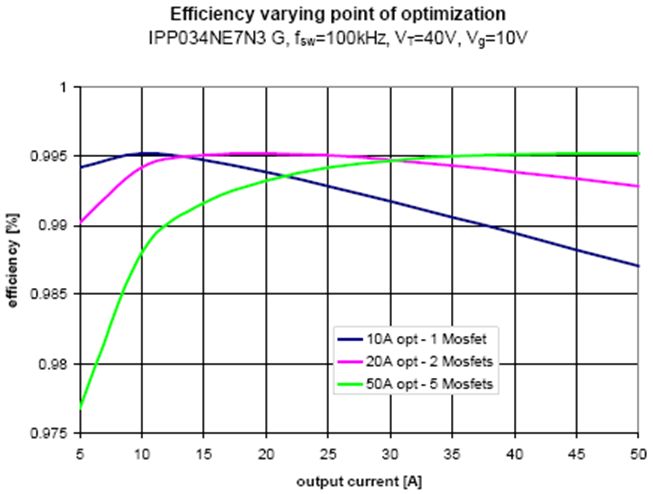為闡明這個問題,圖4顯示了不同優(yōu)化方法得到的效率。圖中所示效率曲線為,當(dāng)變壓器電壓為40V、柵極驅(qū)動電壓為10V、開關(guān)頻率為100kHz時計算得到的12V同步整流級的效率。在75V優(yōu)化表中選擇 IPP034NE7N3,按10 A MOSFET電流進(jìn)行設(shè)計,所得到的優(yōu)化方案僅需一個MOSFET。如圖4所示,這種優(yōu)化方案能夠在低電流時實現(xiàn)很高的效率,而在高電流時效率卻極低。按50 A進(jìn)行優(yōu)化設(shè)計,所得到的最佳方案則需要5個MOSFET。采用這種優(yōu)化方案,低電流時的效率將低得不能接受,但在滿負(fù)載時可以達(dá)到最高效率。因此,對該設(shè)置而言,最佳優(yōu)化方案是采用兩個并聯(lián)的MOSFET,從而獲得整體均衡的效率。