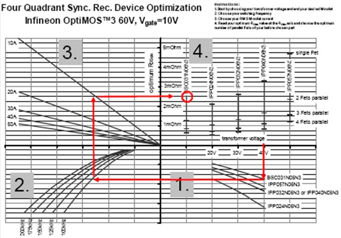 使用優(yōu)化表時,首先從次級變壓器電壓開始。在所用電壓值位置,畫一條垂直的直線。在兩條線相交處可以選出特定的MOSFET。通過一條水平的直線和一條垂直的直線,便可選擇開關(guān)頻率和MOSFET電流。如前面所討論,按最好從滿負(fù)載的20%至30%的電流值開始進(jìn)行選擇。此時,可以在正Y軸上讀取最優(yōu)RDS(on)值。在第四個象限中,顯示了并聯(lián)MOSFET的最佳數(shù)量。在第四個象限中,必須選擇之前在第一個象限中選定的MOSFET型號。然后,按同樣的參數(shù)(變壓器電壓、開關(guān)頻率和電流RMS)對另一個型號的MOSFET重復(fù)執(zhí)行這個選擇過程。比較兩次選擇所得到的最優(yōu)RDS(on)值,最優(yōu)RDS(on)值越低的MOSFET所產(chǎn)生的功耗也越低,因而是更加高效的解決方案。