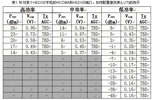 表1所示為針對某個HEDGE手機的WCDMA和HEDGE端口,如何配置查找表(LUT)的例子。該表格針對Avago的3G功率放大器,分為高、中和低功率模式三個主要部分。其它功率放大器因結構不同而具有不同的設置。高、中和低功率模式分區(qū)下各列內(nèi)容為該模式下的輸出功率及其相應的VCON 電壓,這些電壓是基帶處理器生成的電壓,通知FAN5904為功率放大器提供正確的輸出電壓,獲得特定的輸出功率。GSM和EDGE則需要不同的查找表。