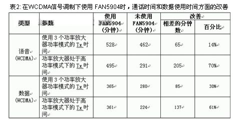 表2顯示了圖1和圖2的結果,以及功率放大器只工作于高功率模式下相應的分鐘數(shù)。在HSUPA、CDMA200 1x EV-DO和TD-SCDMA等不同信號調(diào)制模式下,電流消耗和通話時間都有類似的改善。這里把高功率模式工作的通話/數(shù)據(jù)使用時間一起顯示的原因是:新技術不僅得到了更多的分鐘數(shù),從設計角度來看,亦簡化了校準工作。當功率放大器具有多種功率模式時,固件必需適應何時從一個等級切換到下一個等級,因為在整個輸出功率范圍內(nèi),每個功率放大器的每種功率模式都存在獨特的VPA-POUT 曲線。由于現(xiàn)在大多數(shù)手機都支持至少三個頻段,這意味著滿足要求的系統(tǒng)中可能有三種3G功率放大器,所以增加了復雜程度。在處于一種功率模式的功率放大器中使用FAN5904,可以消除模式切換帶來的復雜性,更快地進行功率放大器校準,因為需要的校準點較少。這樣就縮短了測試/校準的時間,并且降低了制造成本,同時簡化了設計過程。