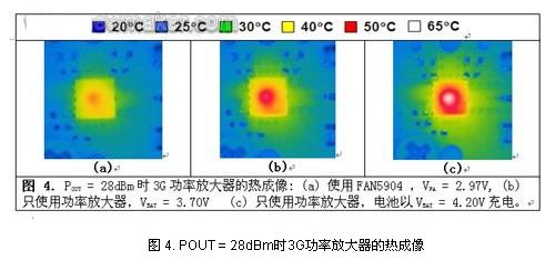 一個時常被忽視,但經(jīng)常遭到抱怨的參數(shù)是耗熱問題。在手持電話貼近頭部進行通話,使用手機網(wǎng)上沖浪或者玩在線網(wǎng)絡游戲時手機發(fā)熱,大多數(shù)用戶會因此而感到煩惱。問題的關鍵在于,設計人員在設計手機時必需將這一因素考慮在內(nèi)。圖4所示為某3G功率放大器的熱成像,其中,(a)為使用FAN5904來供電;(b)為直接與電池連接;(c)為電池以4.2V電壓充電。使用FAN5904時,在滿輸出功率情況下,功率放大器的溫度幾乎不可能達到50?C,在(b)和(c)的情況下,溫度很容易達到50?C和65?C,使用一段時間后,手機會很快發(fā)熱。在數(shù)據(jù)卡應用中,尤其是3G USB調(diào)制解調(diào)器卡開始流行,熱耗散,或者說實現(xiàn)熱耗散最小化變得十分重要。USB卡不能像手機那樣有效地散熱,因為它的體積非常小。由于3G調(diào)制解調(diào)器主要用于數(shù)據(jù),功率放大器在大部分時間運行于“發(fā)熱”狀態(tài)。減少這種熱量的最有效方式是使用諸如FAN5904的降壓轉換器。
