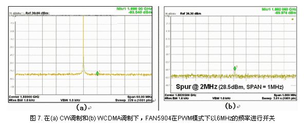 在使用降壓轉換器時,我們關心的是開關頻率如何影響RF性能,RF工程師極不愿意添加一個會對RF信號保真度(發(fā)送和接收兩個方面)造成潛在影響的器件。如前所述,F(xiàn)AN5904采用PWM或PFM模式工作,分析顯示,兩者均不會對RF性能造成影響。圖7(a)所示為28.5dBm信號的發(fā)送CW(關閉調(diào)制以顯示接近中心的尖刺),以及距右側6MHz的標記1。FAN5904產(chǎn)生的假性音調(diào)(spurious tones)水平很低,使得尖刺低于噪聲本底。圖7(b)所示為開啟調(diào)制時的尖刺水平。這種尖刺很小,遠遠低于Tx遮蔽水平。FAN5904具有6MHz 開關頻率的一個優(yōu)勢在于該頻率遠離信號頻率,并且位于5MHz的帶寬之外,轉換成位于WCDMA信號兩側的2.5MHz頻率。
