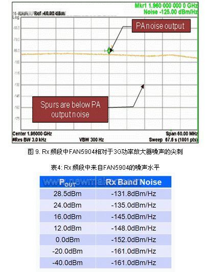 為了進一步了解降壓轉換器帶來的噪聲/尖刺情況,根據(jù)3G功率放大器自身的噪聲輸出,對接收頻段內(nèi)的噪聲進行了測量和比較。圖9顯示在28.5dBm的最高輸出功率下,來自FAN5904的尖刺水平實際上遠遠低于功率放大器的噪聲水平,表4顯示,來自FAN5904 的噪聲在-131.8dBm/Hz處最大,但仍然遠遠低于功率放大器自身的-90dBc。RF工程師可以放心,F(xiàn)AN5904在PWM和PFM模式工作時不會對蜂窩和其它RF頻譜的發(fā)送和接收頻段造成干擾。