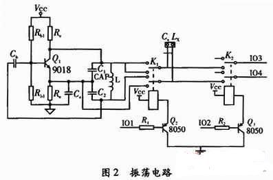 振蕩電路采用LC振蕩電路,振蕩的頻率由L和C確定。振蕩管采用9018,Rb1和Rb2為基極偏置,Rc為限流電阻,電容C1、C2和電感L構(gòu)成正反饋選頻網(wǎng)絡(luò),反饋信號(hào)取自電容C2兩端。該電路也稱(chēng)為電容3點(diǎn)式振蕩電路。輸入信號(hào)和反饋信號(hào)同相。在測(cè)量過(guò)程中,當(dāng)測(cè)量電感時(shí),輸入電路自動(dòng)把待測(cè)電感Lx并聯(lián)到L的兩端。當(dāng)測(cè)量電容時(shí),輸入電路自動(dòng)把要測(cè)量的電容Cx并聯(lián)到C1的兩端。
