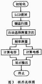 系統(tǒng)上電初始化并且清屏,單片機(jī)初始化完成后,進(jìn)入鍵盤(pán)掃描程序,當(dāng)要進(jìn)行電容或電感測(cè)量時(shí),選擇測(cè)量按鍵,系統(tǒng)進(jìn)行自動(dòng)判斷并進(jìn)行電容或電感的測(cè)量。當(dāng)判斷為電容時(shí),系統(tǒng)選擇電容的計(jì)算方法。當(dāng)判斷為電感時(shí),系統(tǒng)選擇電感的計(jì)算方法。計(jì)算完成后在液晶屏上顯示測(cè)量結(jié)果。下面是具體的程序流程圖,如圖3所示。