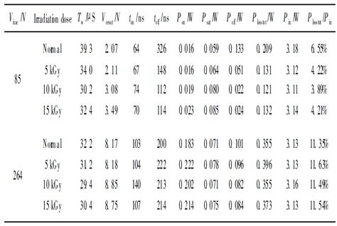 從表2中可以看出, 在85 V 交流輸入電壓下,輻照之后的APT13003E 比未輻照的APT13003E 的關(guān)斷延時(shí)有了大幅的減小, 因此關(guān)斷損耗大幅的減小, 如輻照為10 kGy的管子的關(guān)斷損耗減小為未輻照管子的1 /6; 導(dǎo)通延時(shí)有所增加, 但增加的幅度較小, 導(dǎo)通損耗有較小的增加; 飽和壓降隨輻照劑量的增加而增加, 因此通態(tài)損耗隨輻照劑量的增加而增加。開通損耗、通態(tài)損耗的增加與關(guān)斷損耗的減小是一對矛盾, 因此必須選擇合適的輻照劑量, 才能使開關(guān)晶體管總的損耗最小。