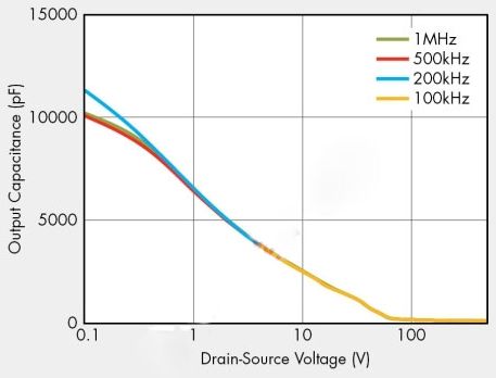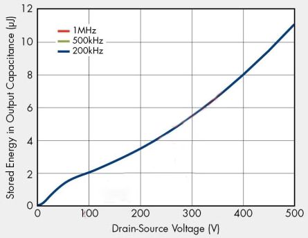 過去,許多設(shè)計人員都使用粗略假設(shè)來提供等效輸出電容值,因為輸出電容通常都指定為25V漏源電壓。不過,傳統(tǒng)的等效輸出電容值在實際應(yīng)用中卻沒有多大幫助,因為它隨漏源電壓變化,并且在開關(guān)導(dǎo)通/關(guān)斷期間不能提供準確的儲能信息。在功率轉(zhuǎn)換器工作電壓下,新定義的輸出電容提供等效的儲能,能夠?qū)崿F(xiàn)更優(yōu)化的功率轉(zhuǎn)換器設(shè)計。
