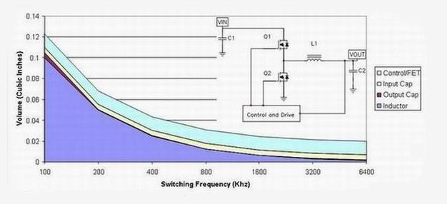 圖1 顯示的是降壓電源頻率與體積的關(guān)系。頻率為 100 kHz 時(shí),電感占據(jù)了電源體積的大部分(深藍(lán)色區(qū)域)。如果我們假設(shè)電感體積與其能量相關(guān),那么其體積縮小將與頻率成正比例關(guān)系。由于某種頻率下電感的磁芯損耗會(huì)極大增高并限制尺寸的進(jìn)一步縮小,因此在此情況下上述假設(shè)就不容樂(lè)觀了。如果該設(shè)計(jì)使用陶瓷電容,那么輸出電容體積(褐色區(qū)域)便會(huì)隨頻率縮小,即所需電容降低。另一方面,之所以通常會(huì)選用輸入電容,是因?yàn)槠渚哂屑y波電流額定值。該額定值不會(huì)隨頻率而明顯變化,因此其體積($區(qū)域)往往可以保持恒定。另外,電源的半導(dǎo)體部分不會(huì)隨頻率而變化。這樣,由于低頻開(kāi)關(guān),無(wú)源器件會(huì)占據(jù)電源體積的大部分。當(dāng)我們轉(zhuǎn)到高工作頻率時(shí),半導(dǎo)體(即半導(dǎo)體體積,淡藍(lán)色區(qū)域)開(kāi)始占據(jù)較大的空間比例。此主題相關(guān)圖片如下:圖1 :電源組件體積主要由半導(dǎo)體占據(jù)。