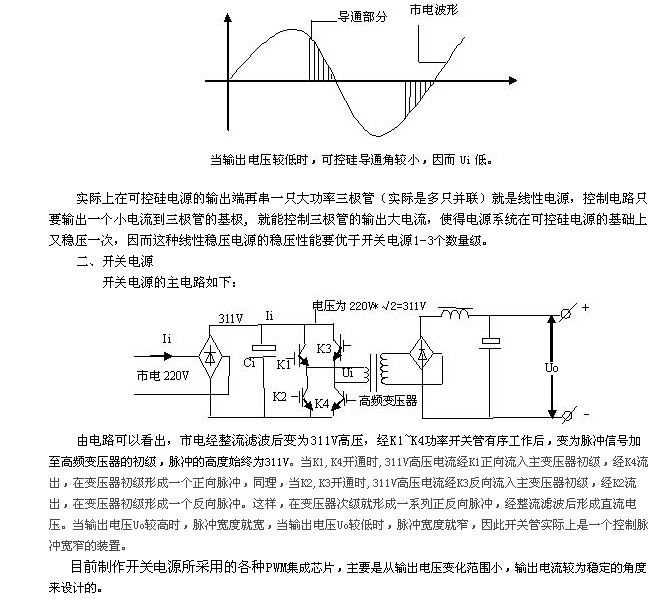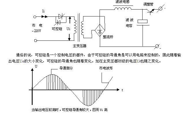 也就是~220V市電經(jīng)可控硅控制后只有一部分加在主變壓器的初級。當(dāng)輸出電壓Uo較高時,可控硅導(dǎo)通角較大,大部分市電電壓被可控硅“放過來了”(如上圖所示),因而加在變壓器初級的電壓,即Ui較高,這當(dāng)然經(jīng)整流濾波后輸出電壓也就比較高了。