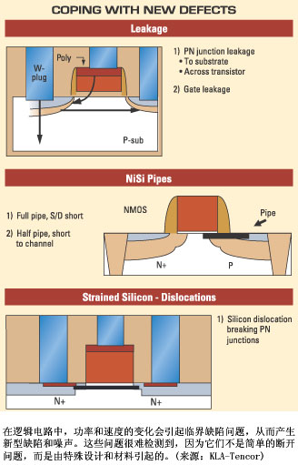 涉足尖端技術(shù)研究工作的芯片制造商正在把無(wú)數(shù)新材料和奇特的器件結(jié)構(gòu)結(jié)合起來(lái),用于65nm及更低節(jié)點(diǎn)的量產(chǎn)。同時(shí)他們發(fā)現(xiàn),在這些研究上的努力生產(chǎn)的結(jié)果還包括目前必須著手解決各器件各個(gè)層上出現(xiàn)的越來(lái)越多的細(xì)微的電缺陷和微小物理缺陷。在存儲(chǔ)器中,可能會(huì)出現(xiàn)多晶硅阻塞管道問(wèn)題poly-plug piping problems,從而引起B(yǎng)PSG(硼磷硅酸鹽玻璃)孔隙問(wèn)題。在邏輯領(lǐng)域,使用應(yīng)變硅引起的應(yīng)變硅位錯(cuò)可能產(chǎn)生缺陷,有時(shí)這類(lèi)缺陷直到后道工藝才顯露出來(lái)。