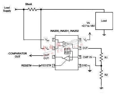 在許多應(yīng)用中,電流應(yīng)與某個(gè)設(shè)定值相比較。通常說(shuō)來(lái),進(jìn)行電流比較還需要電流分路.、比較器和參考電壓。此外,理想的比較器輸出應(yīng)與大多數(shù)常見的邏輯電路很好地兼容。圖 5 給出了電流比較的例子。在本例中,將電流與采用 TI INA200 系列電流分路.和比較器的簡(jiǎn)單單電壓結(jié)點(diǎn)進(jìn)行了比較。R1 和 R2 形成分壓器,以根據(jù) INA200 系列比較器的內(nèi)置 0.6V 電壓結(jié)點(diǎn)來(lái)設(shè)置電壓結(jié)點(diǎn)。(INA200 系列的增益很有特點(diǎn):INA200 的增益為 20,INA201 的增益為 50,INA202的增益為 100。)