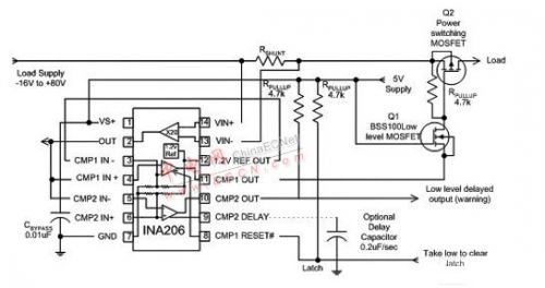 某些系統(tǒng)需要不止一個(gè)電流限制電平。舉例來(lái)說(shuō),系統(tǒng)以較低的電流限制作為故障即將發(fā)生的指示器,而以較高限制作為關(guān)閉系統(tǒng)的標(biāo)志。INA206-INA208 系列電流分路.采用兩個(gè)比較器來(lái)實(shí)現(xiàn)上述功能。某些系統(tǒng)會(huì)對(duì)較低限制采用延遲輸出,以避免超出最低限制后引起不必要地觸發(fā)瞬態(tài)偏移。圖 6 中的電路將 INA206 電流分路.部分的輸出反饋給兩個(gè)比較器,這會(huì)生成一個(gè)有效的低輸出警報(bào),并為關(guān)閉 MOSFET 緩沖路徑提供適當(dāng)極性。