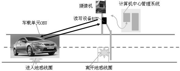 OBU 中存有車輛的識別信息,如車牌號、汽車ID號,一般安裝于車輛前面的擋風玻璃上,RSU安裝于收費站旁邊,環(huán)路感應器安裝于車道地面下。中心管理系統(tǒng)有大型的數(shù)據(jù)庫,存儲大量注冊車輛和用戶的信息。當車輛通過收費站口時,環(huán)路感應器感知車輛,路邊單元發(fā)出詢問信號,車載單元做出響應。并進行雙向通信和數(shù)據(jù)交換,中心管理系統(tǒng)獲取車輛識別、車型等信息并和數(shù)據(jù)庫中相應信息進行比較判斷,根據(jù)不同情況來控制管理系統(tǒng)產生不同的動作。通過路邊單元與車載單元進行相互通信和信息交換,以達到對車輛的自動識別,并自動從該用戶的專用帳戶中扣除通行費,從而實現(xiàn)自動收費。