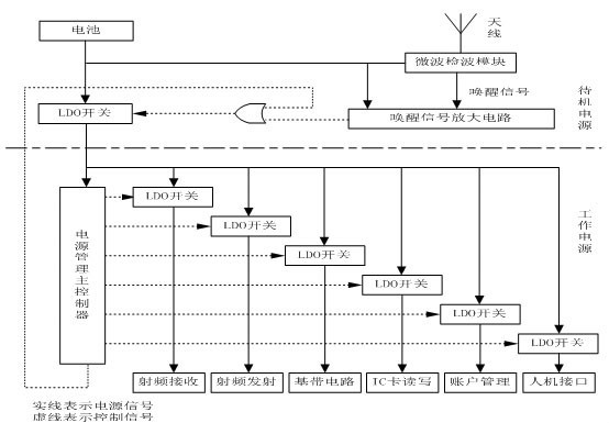 如OBU這種以嵌入式處理器為核心的系統(tǒng),其功耗主要由處理器功耗和外圍電路功耗組成??紤]實際的運行情況,汽車在公路上行駛的整個過程中,經過收費站的時間是非常短的,OBU只需要在汽車經過收費站時工作,而且工作時間不到一秒鐘,其他絕大部分時間都不需要工作。OBU智能電源管理采用電池供電的方法,控制OBU 工作在兩種模式,睡眠模式和激活模式;當車進入收費站時,OBU被激活,開始工作,處于激活模式;當交易完成,車離開收費站后,OBU馬上停止工作進入睡眠模式。根據(jù)這種特點,對電源采用分級管理的策略,即分為待機電源與工作電源,如圖2.1。
