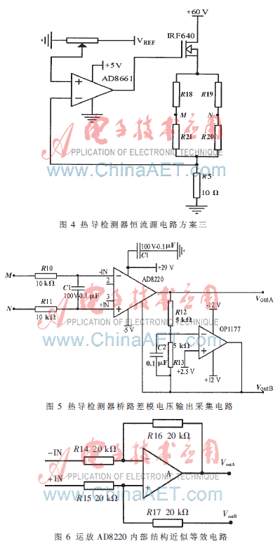 本文對三套恒流源進(jìn)行分析、比較、實(shí)驗,表明方案一的基線噪聲、溫度漂移小,優(yōu)于現(xiàn)有色譜儀熱導(dǎo)檢測器的指標(biāo),而且電橋檢測電路承受的共模電壓小,有利于保護(hù)檢測電路。