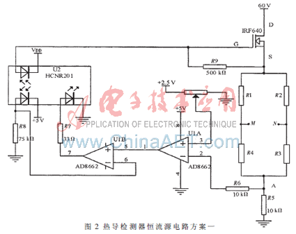 如圖2所示為恒流源的電路圖。輸出信號為M、N,即通過測量M、N兩點(diǎn)間的電位差,就能測出物質(zhì)的成分和含量。圖2中R5是采樣電阻,阻值10 Ω,當(dāng)電流為上限250 mA時,采樣電壓為2.5 V,采樣電壓輸入到AD8662的2腳,AD8662的3腳接電位器RW,RW的一端接地,另一端接+2.5 V電壓基準(zhǔn),此+2.5 V是通過穩(wěn)壓芯片ADR431輸出,溫度穩(wěn)定1 ppm/℃。設(shè)定好電位器的電壓后,當(dāng)AD8662的2腳、3腳電壓不相等時,其差壓經(jīng)運(yùn)放AD8662開環(huán)放大(開環(huán)放大倍數(shù)2.2×105)驅(qū)動AD8662的5腳,U1B和線性光耦HCNR201構(gòu)成光耦隔離的放大電路,放大比為500 K/75 K=6.7倍。AD8662和HCNR201構(gòu)成放大比1.47×106的差壓放大電路,并且起到穩(wěn)流作用。當(dāng)橋流有0.1 μA的波動時,施加到IRF640柵極的電壓變化達(dá)1.47 V,使IRF640增加或減小電流,從而消除電流波動。