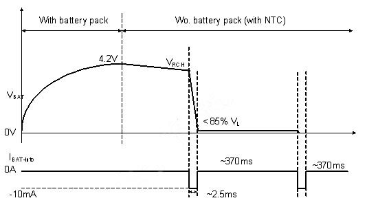 使用者亦有可能在充電或式充電完畢后,在未將電源移除的情況下,即抽離電池的情況。為避免造成危險,IC內(nèi)部應(yīng)具有如圖7, 8的電池存在偵測機(jī)制。充電IC會以短時間脈沖(每370ms產(chǎn)生2ms的脈沖)方式抽取電池電流,此時若電池存在,則偵測到的電池電壓應(yīng)大于一預(yù)設(shè)閥值;若電池已切離,則充電IC偵測到一低電壓,即可判定為電池斷開狀態(tài),并將電池端電壓切斷,保護(hù)使用者安全。