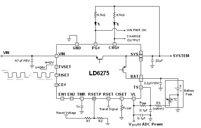 為滿足低耗電可攜式產(chǎn)品對于更精確、更安全的充電器應(yīng)用需求,許多IC制造商發(fā)展出低成本線性充電器。圖2是以通嘉科技的LD6275充電IC為設(shè)計范例,構(gòu)成僅需少數(shù)外部零件的獨(dú)立式線性充電器電路,其具備1.5A的最大充電電流。