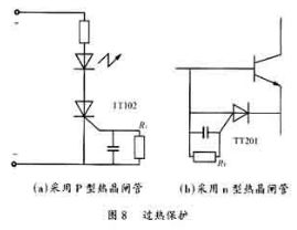 采用溫度繼電器來檢測電源裝置內(nèi)部的溫度,當(dāng)電源裝置內(nèi)部產(chǎn)生過熱時,溫度繼電器就動作,使整機告警電路處于告警狀態(tài),實現(xiàn)對電源的過熱保護(hù)。亦可將溫度繼電器置于開關(guān)三極管的附近,一般大功率管允許的最高管殼溫度是75℃,調(diào)節(jié)溫度整定值為60℃。當(dāng)管殼溫度超過允許值后繼電器就切斷電器,對開關(guān)管進(jìn)行保護(hù)。半導(dǎo)體熱敏開關(guān)器件“熱晶閘管”在超溫保護(hù)方面有重要作用。它可以用作溫度指示電路。根據(jù)p型控制柵熱晶閘管(TT102)的特性,由RT值確定該器件的導(dǎo)通溫度,RT越大,導(dǎo)通溫度越低。當(dāng)將其放置功率開關(guān)三極管附近,或在電源裝置內(nèi)時,它就能起到溫度指示作用。當(dāng)功率管的管殼溫度或者裝置內(nèi)部的溫度超過允許值時,熱晶閘管就導(dǎo)通,使發(fā)光二極管發(fā)亮告警。倘若配合光電耦合器,就可使整機告警電路動作,保護(hù)開關(guān)穩(wěn)壓器。它亦可以象圖8(b)那樣用作功率晶體管的過熱保護(hù),晶體開關(guān)管的基極電流被n控制柵型熱晶閘管TT201旁路,開關(guān)管截止,切斷集電極電流,防止過熱。