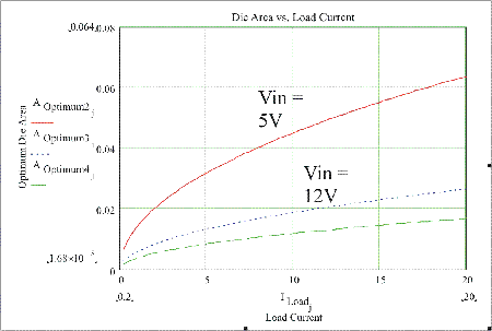 上述方程根據(jù)一組特定的固定參數(shù)清楚地確定了最優(yōu)化的裸片面積。實(shí)際上,有必要被擴(kuò)展到包含一定范圍內(nèi)的工作條件,如頻率、負(fù)載電流、輸入電壓和門驅(qū)動(dòng)條件。幸運(yùn)的是,在個(gè)人電腦市場(chǎng),輸入電壓和每相的電流被保持在相當(dāng)窄的范圍內(nèi)。這就使開關(guān)頻率和門驅(qū)動(dòng)器成為唯一的兩個(gè)真實(shí)變量。