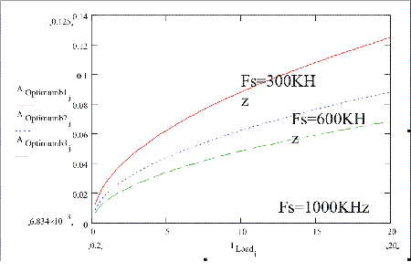 圖4:在同步整流器MOSFET不同開關(guān)頻率上的最優(yōu)化裸片面積是負(fù)載電流的函數(shù)。