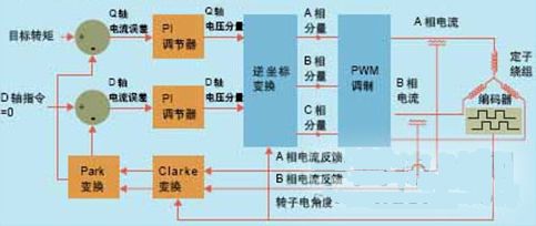 從控制原理上講,磁場定向控制方法的電流環(huán)運行是獨立于電機(jī)旋轉(zhuǎn)的。在FOC方法中存在兩個實際的電流環(huán),一個用于Q軸轉(zhuǎn)矩,另一個用于D軸轉(zhuǎn)矩。Q軸轉(zhuǎn)矩電流環(huán)施以來自伺服控制器的用戶目標(biāo)轉(zhuǎn)矩,D軸電流環(huán)則施以零輸進(jìn)指令,以便使不想要的直軸分量降至最低。