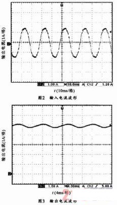 圖3所示為輸入220V,輸出滿(mǎn)載時(shí)的輸出電流波形。紋波電流峰峰值120mA,輸出電流中疊加有2倍市電供電頻率的紋波電流。