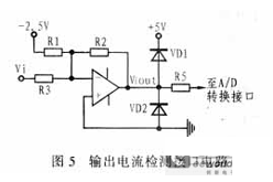 ADMC331內(nèi)的A/D轉(zhuǎn)換器由7個模擬輸入通道和比較器等電路組成,數(shù)據(jù)轉(zhuǎn)換是通過判斷模擬輸入量與片內(nèi)高穩(wěn)定度鋸齒波的交點(diǎn)來實(shí)現(xiàn)的??紤]到A/D 轉(zhuǎn)換器能接受的電平范圍為0~+5V,因此必須將電壓互感器檢測的電壓和電流傳感器檢測的電流(轉(zhuǎn)換為電壓量)按照一定比例轉(zhuǎn)換到這個范圍內(nèi)。輸出電壓和電流檢測接口電路分別如圖4和圖5所示,這部分電路的輸入阻抗應(yīng)比較大,以盡量減少對設(shè)備信號的影響,并且輸出阻抗應(yīng)同A/D轉(zhuǎn)換器的輸入阻抗相匹配。