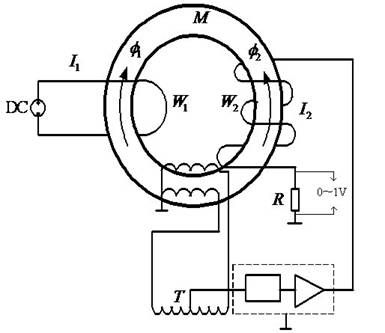 采用與以上信息相對(duì)應(yīng)的傳感器和變換器對(duì)數(shù)據(jù)進(jìn)行測(cè)量,溫度傳感器采用精密鉑電阻溫度傳感器PT100,該傳感器按照IEC751國(guó)際標(biāo)準(zhǔn)設(shè)計(jì)和制作,利用鉑電阻在溫度發(fā)生變化時(shí)其電阻值也發(fā)生變化的特性來(lái)測(cè)量溫度,傳感器元件由鉑絲燒制,穩(wěn)定性高,測(cè)量范圍廣,利用兩個(gè)溫度傳感器可以分別對(duì)光伏組件表面溫度和環(huán)境溫度進(jìn)行測(cè)量,將被測(cè)溫度轉(zhuǎn)換成(4~20)mA DC二線制標(biāo)準(zhǔn)信號(hào)而遠(yuǎn)程發(fā)送。電壓的測(cè)量采用四通牌ST-A系列的STCV-800電壓傳感器,該系列傳感器廣泛用于電力系統(tǒng)的監(jiān)測(cè),電壓測(cè)試范圍分別為0~1200V.直流電流的測(cè)量選用武漢儀表公司生產(chǎn)的HD系列高精度直流大電流傳感器。其工作原理如圖2所示。