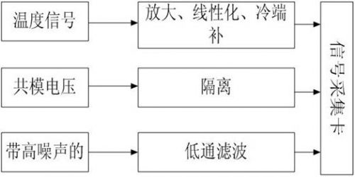 直接采集來(lái)的信號(hào)由于噪聲等原因不一定能夠滿足采集系統(tǒng)的要求,為了適合數(shù)據(jù)采集設(shè)備的輸入范圍,由傳感器生成的電信號(hào)必須經(jīng)過(guò)處理。信號(hào)調(diào)理裝置能夠按照要求放大或者縮小電壓電流范圍,并對(duì)信號(hào)進(jìn)行隔離濾波等處理。光伏監(jiān)測(cè)系統(tǒng)的信號(hào)調(diào)理圖如圖3所示。