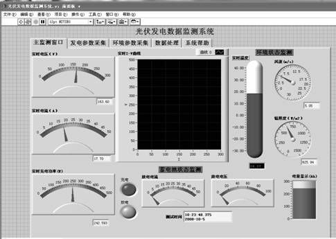 由于Labview使用G語(yǔ)言(圖形化語(yǔ)言)進(jìn)行程序設(shè)計(jì),因此該系統(tǒng)界面包含了光伏發(fā)電監(jiān)測(cè)系統(tǒng)所要進(jìn)行監(jiān)測(cè)的溫度、電流、電壓以及輻照度等的全部信息,Labview中的VI程序由前面板、程序框圖、VI圖標(biāo)3部分構(gòu)成,其中前面板是VI 程序的用戶操作界面,是VI程序的交互式輸入和輸出端口。如圖4所示,系統(tǒng)前面板即系統(tǒng)界面主要由主監(jiān)測(cè)界面以及各種參數(shù)界面組成。主界面主要由發(fā)電參數(shù)監(jiān)測(cè)模塊、環(huán)境參數(shù)監(jiān)測(cè)模塊和數(shù)據(jù)處理模塊3部分組成,各獨(dú)立參數(shù)模塊可以進(jìn)行有關(guān)的參數(shù)設(shè)置,實(shí)時(shí)顯示數(shù)據(jù),數(shù)據(jù)處理模塊可以存儲(chǔ)相關(guān)的歷史數(shù)據(jù)并進(jìn)行數(shù)據(jù)回放,以便對(duì)特定模塊單獨(dú)進(jìn)行分析處理。
